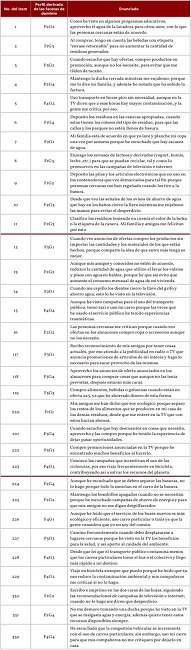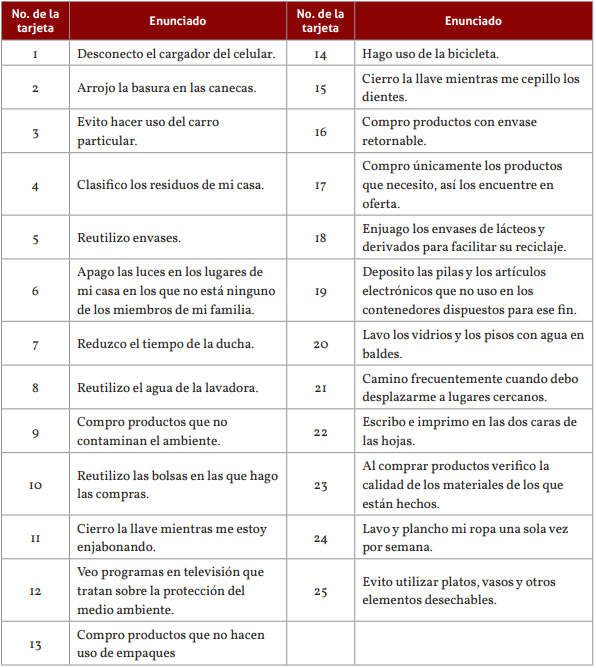 El segundo tipo de instrumento utilizado consistió en una entrevista individual, siguiendo el protocolo de Clasificación Múltiple de Ítems CMI (Canter, 2016; Pinilla y Páramo 2017), que consiste en presentar al entrevistado un conjunto de tarjetas que incluyen generalmente palabras sueltas, frases o imágenes, las cuales son clasificadas por el participante varias veces de forma libre, a partir de lo cual se explora el sistema conceptual de los individuos sobre el dominio de interés; y posteriormente se solicita organizar las tarjetas a partir de algún criterio impuesto por el entrevistador. En el caso particular de este estudio se emplearon 25 tarjetas, numeradas al respaldo, con expresiones escritas que hacían alusión a comportamientos ambientalmente relevantes derivados de la literatura científica (Corral y Pinheiro, 2004; Schultz & Kaiser, 2012). El contenido de las tarjetas se presenta en la tabla 2.