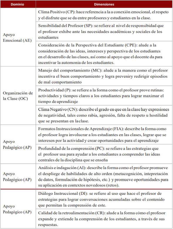 Teniendo en cuenta lo anterior, este estudio pretende centrarse en la descripción de las interacciones profesor estudiante en el área ciencias en educación secundaria en colegios con alto y bajo desempeño en las pruebas nacionales. Esta descripción se realiza tomando en cuenta los tres grandes dominios de las interacciones: apoyo pedagógico, apoyo emocionaly organización de la clase (Pianta & Allen, 2008; Pianta, Hamre y Allen, 2012), que han sido operacionalizados en la pauta de observación Classroom Assessment Scoring System (CLASS) (ver Pianta, Hamre & Mintz, 2012).