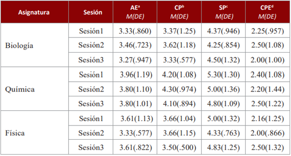 La tabla 2 muestra los puntajes de los salones de clase en cada asignatura en el dominio de apoyo emocional y de sus tres dimensiones. Puede observarse que el nivel de apoyo emocional de los salones de clase durante las clases de la unidad fue medio en las tres asignaturas. Al analizar las dimensiones de este dominio, la tabla 1 muestra que los salones de clase presentaron un nivel medio de clima positivo (puntajes entre 3 y 4) en las asignaturas de biología, química y física: respeto en las relaciones entre profesores y estudiantes, pero con cierta distancia y pocas comunicaciones positivas.