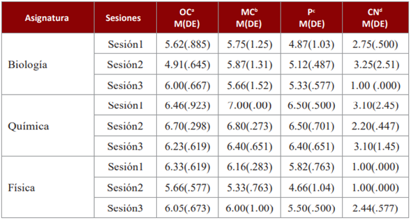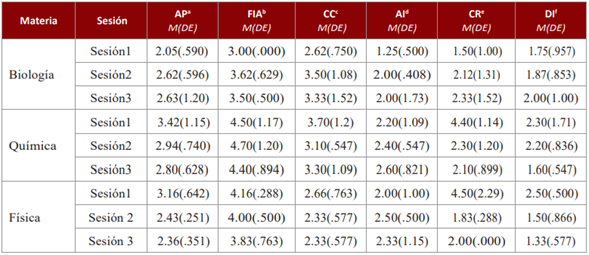 En la sensibilidad del profesor se observa que en los salones de clase los profesores presentaron un nivel medio (puntajes entre 3 y 5, ver tabla 2), lo cual indica que a veces en las clases se realizó un monitoreo de los estudiantes y respuesta a ciertas necesidades, como preguntas o dificultades en la comprensión, además de cierta comodidad de los estudiantes para referirse al profesor. En la consideración de la perspectiva del estudiante, se encontraron niveles bajos (puntajes entre 1 y 2) en todos los salones de clase. Esto indica que los profesores de las tres áreas de ciencias favorecieron poco la autonomía de los estudiantes, generaron pocos espacios de expresión para los estudiantes y poco trabajo entre pares durante las sesiones.
