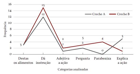 A ação imperativa no caso da CB facilita que a criança avance no reconhecimento e manuseio dos objetos, entregando o uso na mão da criança e tendo mostrado o que fazer previamente. No caso da CB a cuidadoravai procurar alimentos e entrega o alimento, sempre em um sentido funcional da alimentação, carecendo de qualquer tentativa de significação da ação para a criança. As frequências mostram diferenças nas dinâmicas comunicativas, nas práticas educacionais e nos propósitos das cuidadoras no que tangem às dinâmicas semióticas em ambos os casos.