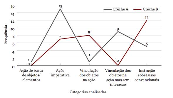 Ações de busca de objetos/elementos parecem similares em ambas as turmas (CB 1 e CA 0). Porém, Ação imperativa (CB 15 e CA 7); Vinculação dos objetos na ação (CB 8 e CA 1); Vinculação dos objetos sem interação (CB 9 e CA 0) e Instrução sobre usos convencionais(CB 12 e CA 5) parecem ter particularidades nas dinâmicas de cada turma.