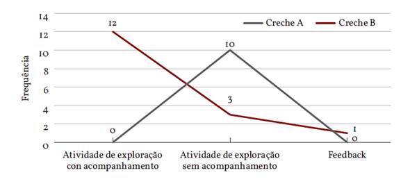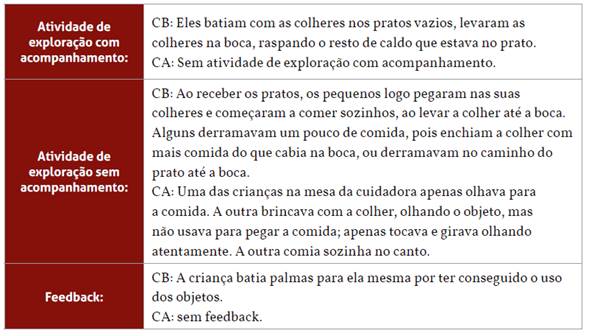 Os exemplos ilustram o que está sendo apresentado: “Ao receber os pratos, os pequenos logo pegaram nas suas colheres e começaram a comer sozinhos, ao levar a colher até a boca. Alguns derramavam um pouco de comida, pois enchiam a colher com mais comida do que cabia na boca, ou eles derramavam no caminho do prato até a boca”. No caso da Atividade de exploração com acompanhamento, a esfera semiótica que as ações educacionais e a intencionalidade educacional denotam na Creche B ficam expressas no exemplo. As crianças pegam as colheres e as usam de forma convencional, o que revela uma apropriação dos usos dos objetos, dos vínculos e da importância do engajamento na relação triádica no processo educacional (Rodríguez et. al. , 2017). Já no caso da intervenção da cuidadora na CA: “Uma das crianças na mesa da cuidadora apenas olhava para a comida. A outra brincava com a colher, olhando o objeto, mas não usava para pegar a comida, apenas tocava e girava olhando atentamente. A outra comia sozinha no canto” deixa claro que há uma Atividade de exploração sem acompanhamento, o que indica que a criança, embora faça exploração dos objetos, não consegue enriquecer a semiose da ação porque ela precisa dos índices e símbolos que o outro oferece na relação triádica.