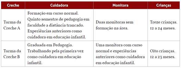 Foi dada a atenção às duas principais refeições feitas nesse turno que são: o lanche da manhã e o almoço. As turmas foram definidas de acordo com o critério de idade, entre 12 e 24 meses, a fim de buscarmos as semelhanças e as diferenças no trabalho pedagógico durante as refeições, assim como na mediação dos educadores e no uso dos objetos presentes nesses momentos. Os participantes são apresentados na tabela 1.
