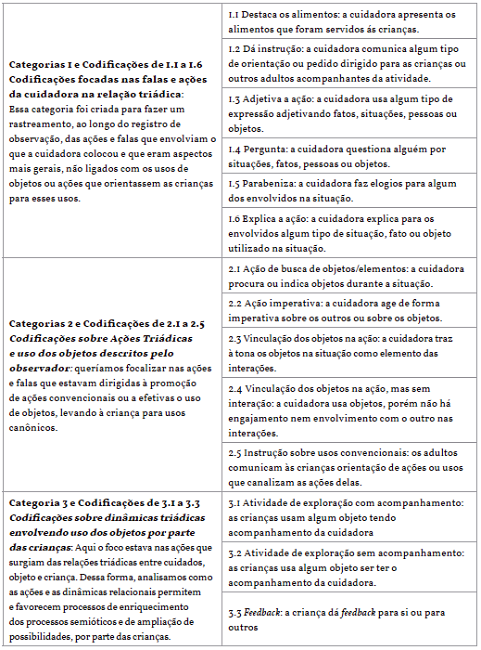 As falas, ações e aspectos metacomunicativos foram aglutinados em categorias que fornecem um panorama geral dos trechos específicos (segmentos) analisados em cada observação e que destacam os aspectos que eram relevantes. A análise mi- crogenética permite identificar como as ações e diálogos identificados como re- levantes durante a observação permitem relacionar com categorias em relações específicas - fazer uma meta-análise dos snapshots descritos. A ideia é estabelecer vínculos, características e particularidades para identificar ações educacionais (in- tencionais) e dinâmicas relacionais entre as cuidadoras e as crianças em sala. De- viam-se salientar os níveis de integração das ações educacionais que consideram o uso convencional dos objetos no contexto da alimentação e os aspectos semióticos que circulam ao redor dos usos de objetos e dos momentos de alimentação.