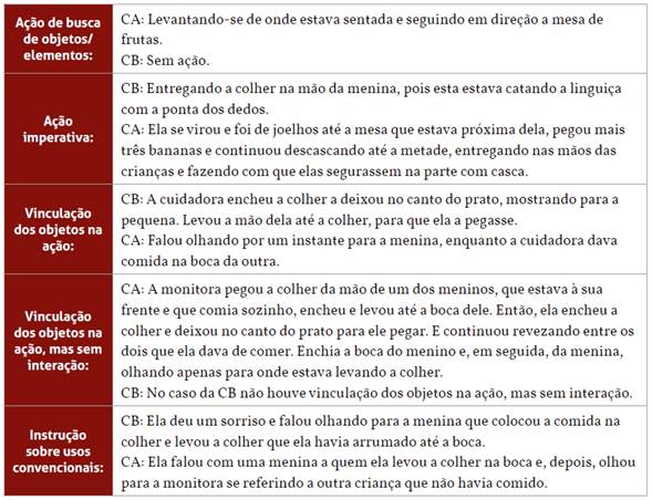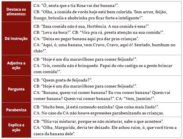 Aprofundando no que ocorreu na subcategoria Ação Imperativa, vemos como no caso da CB a cuidadora faz esse tipo de ações: “Entregando a colher na mão da menina, pois esta estava catando a linguiça com a ponta dos dedos”. Já no caso da CA, as intervenções da cuidadora podem ser exemplificadas aqui: “Ela (a cuidadora) se virou e foi de joelhos até a mesa que estava próxima dela, pegou mais três bananas e continuou descascando até a metade, entregando nas mãos das crianças e fazendo com que elas segurassem na parte com casca”.
