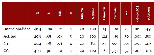 La asimetría es positiva en intencionalidad .14, norma subjetiva .57 y control conductual 1.61 y es negativa en actitud -.24. El aplanamiento platicurtico fue en intencionalidad con curtosis -.78, actitud .59 y norma subjetiva -.09 en control conductual es leptocúrtica con curtosis=3.32 y el promedio en intencionalidad es de 40.41 (s= 1.08), actitud 40.83 (s=.68) norma subjetiva 40.4 (s=.78). Según el test de kolmogorov - smirnov la intencionalidad, actitud, norma subjetiva y control conductual difieren de una distribución normal p=<.001. Concluyendo que en todos los casos la muestra no es paramétrica.