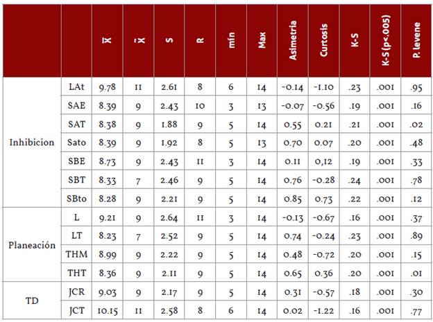 En la inhibición la asimetría es negativa en Laberintos -.14 y Stroop A-error, -.07 pero es positiva en Stroop A, .70, tiempo .55, Stroop B-error .11, total .76 y tiempo .85 y la curtosis es platicurtica en Laberintos -1.10, Stroop A error -.56 y Stroop B total -.28 pero leptocurtica en Stroop A total .07, tiempo .21, error -.56 y Stroop B tiempo .73. El test de Kolmogorov - smirnov en todos los instrumentos difieren de una distribución normal p=<.001. Lo que hace concluir que los resultados de la muestra no son paramétricos.