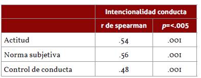 La estructura cognitiva de intencionalidad, se soporta en la relación con las actitudes r=.54; p=<.001, norma subjetiva r=.56; p=<.001 y control conductual r=.48; p=<.001, similar a lo nombrado por Dueñez (2010) al describir intención con actitudes r=.52, p<.001 y en análisis de regresión múltiple con actitudes β =.46; p<.001 norma subjetiva β=.22; p<.005 y prediciendo la intención conductual F=2, 75 (17.15); p=.001.