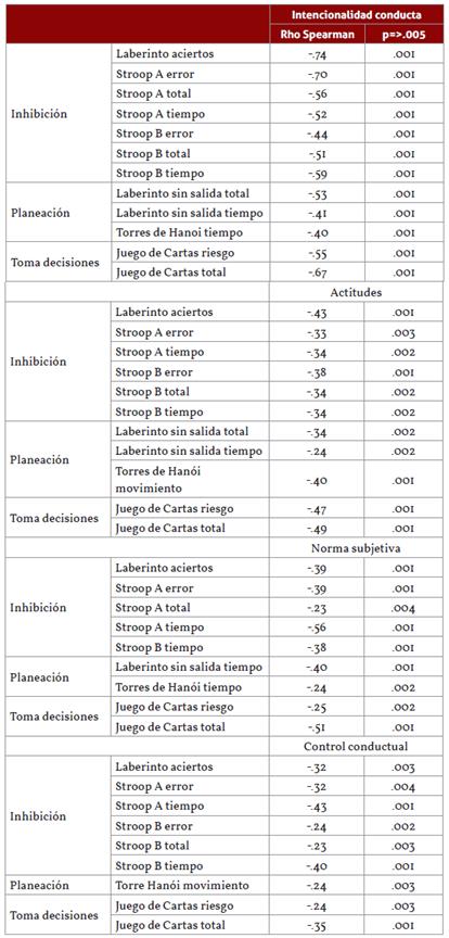 Existe correlación de tipo negativa, entre la intencionalidad y planeación con laberinto sin salida de tipo moderada r=-.53; p=<.001, con Laberintos tiempo r=-.41; p=<.001 y Torres de Hanoi tiempo r=-.4o; p=<.001, en todos los casos la significatividad es alta y la correlación es moderada negativa con toma de decisiones en Juego de Cartas con riesgo r=-.55; p=<.001 y es buena con Juego de Cartas total r=-.67; p=<.001.