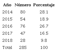 En 44 de los manuscritos identificados, no fue posible establecer la fecha a partir de los metadatos, por lo que se hizo necesaria una búsqueda de cada uno de ellos para identificar esta información. La distribución por años, una vez hecha esta búsqueda, se presenta en la Tabla 1, de la cual se excluyeron 18 documentos; 14 porque definitivamente no se tuvo acceso a ellos, y cuatro porque estaban por fuera del rango de años de publicación. Por tal motivo, el número de manuscritos disponibles fue de 285.