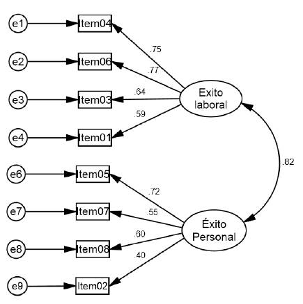 El AFC permite observar valores significativos (p<.05) entre los ocho componentes manifiestos (figura 1). Los pesos estimados de regresión estandarizados indican que entre los ítems y el factor autopercepción de éxito, existen niveles moderados en los ítems con valores entre .40 y .77 (figura 1). Se observa que los ítems se relacionan positivamente entre sí en cada factor.