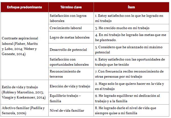 El estudio de la autopercepción del éxito se ha efectuado en diferentes ámbitos, como: aspiración laboral (Fisher, Maritz y Lobo, 2014; Weber y Geneste, 2014), estilo de vida y trabajo (Robles y Marcelino, 2013; Visagie y Koekemoer, 2014) y afectivo -familiar (Padilla y Serarols, 2006); partiendo de los términos clave de estos ámbitos se detectó que la medición de la autopercepción de éxito, requiere de instrumentos que cumplan con un rigor metodológico aplicables a sujetos en contextos específicos, cuyos resultados permitan tomar decisiones de apoyo a los trabajadores. A partir de esta necesidad, el propósito de esta investigación fue el diseño, análisis de confiabilidad, análisis factoriales exploratorio y confirmatorio de una escala para colaboradores de empresas medianas en México (tabla 1).