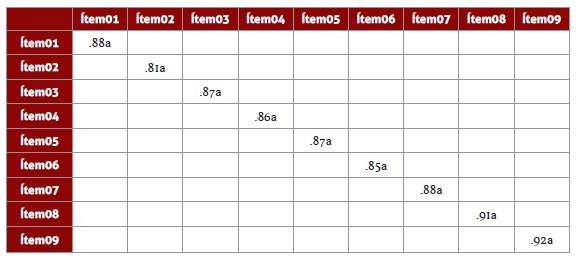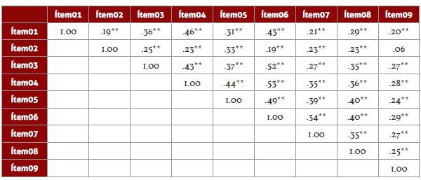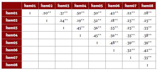 Se realizó el análisis de confiabilidad con el propósito de extraer la consistencia interna del instrumento por medio del Coeficiente de Pearson (CP), se obtuvieron veintiocho correlaciones con un nivel de significancia p<.01 (tabla 10); las correlaciones en su mayoría son regulares, las tres más altas fueron entre los ítems uno y cuatro (.50), tres y seis (.53) y cuatro y seis (.56). Finalmente, el valor a de Cronbach obtenido en la escala final fue aceptable (α=.805).