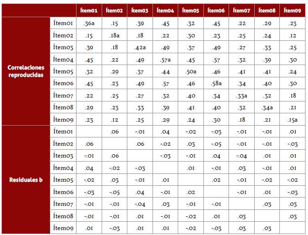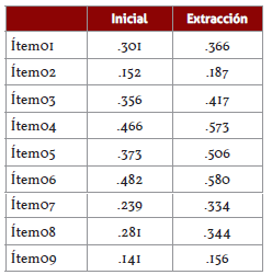 El análisis de fiabilidad por medio del coeficiente Alpha de Cronbach fue de .880 con los nueve ítems iniciales. El análisis del ajuste de este coeficiente, considerando la posibilidad de eliminación de ítems, no presenta variaciones representativas por lo que no se eliminaron ítems en esta etapa del análisis.