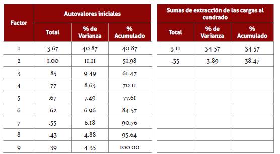 Para la determinación de las dimensiones se tomaron como criterios: 1) que todos los ítems tuvieran coeficiente de factor ≥.40 durante la extracción, que se consideran adecuados; 2) que el primer factor explicara una proporción importante de varianza respecto a los demás factores; 3) que la varianza total explicada por los factores extraídos fuera mayor al 40%.