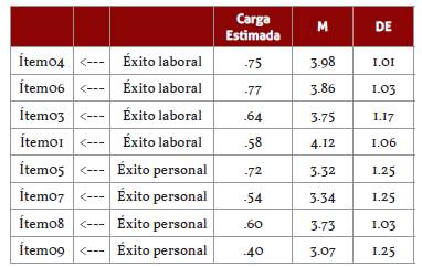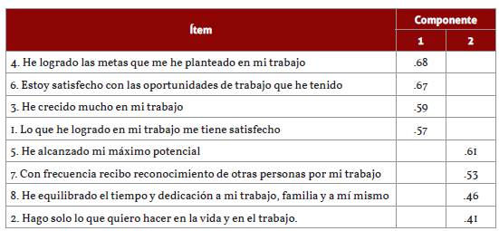 Los pesos factoriales ítem-factor fueron significativos (p<.0.01), la variación osciló entre .57 y .68 para el primer factor y, entre .41 y .61 para el segundo factor. El contenido de los ítems sugiere la posibilidad de denominar al primero como éxito laboral y al segundo como éxito personal como componentes de la autopercepción de éxito, lo cual se debe confirmar mediante el AFC.