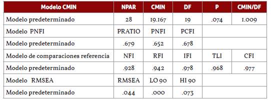 El modelo de coeficiente de discrepancia mínimo (CMIN) realizado con el software AMOS, presentó un índice de bondad de ajuste chi-cuadrado significativo X2=19.167, p=.074 para un CMIN=19.167. Arbuckle (2014) sugiere que el CMIN dividido entre los Grados de Libertad (DF), debe ser un índice menor a 5; el modelo obtuvo un índice CMIN/DF de 1.009, por lo tanto es adecuado.