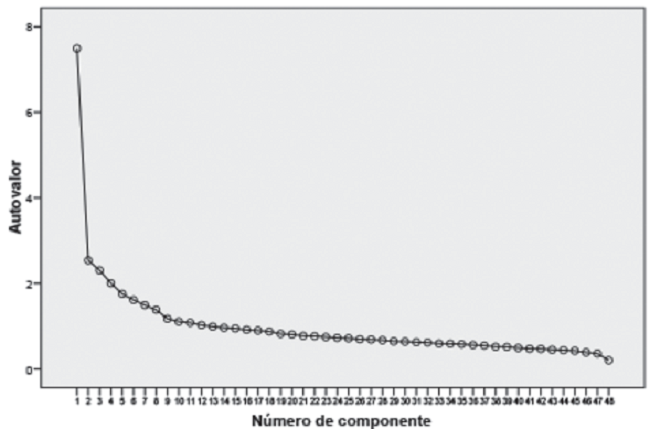 Sin embargo, se siguió con el ACP con rotación Promax. También se realizó un prueba Varimax, pero no hubo diferencia significativa entre las pruebas, por eso, se decidió continuar con Promax para el análisis final y definitivo. Se graficó la sedimentación de los 48 componentes de la escala y se verifica que a partir del ítem 9 empieza a ser recta la curva y por tanto a partir de este se explica la mayor parte de la variabilidad escalar (figura 1).