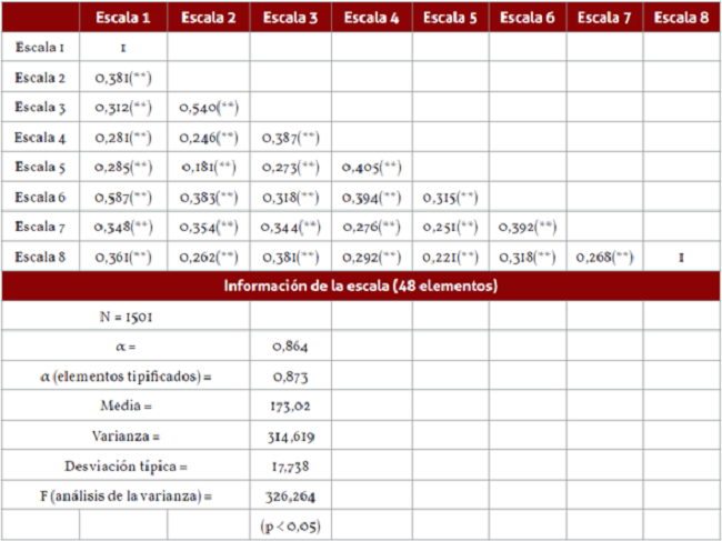 A partir de lo anterior, se sometieron los 48 componentes de la escala a un análisis de fiabilidad alfa de Cronbach que dio como resultado una consistencia interna del 86,4 % (α=0,864) y un alfa para elementos tipificados del 87,3 % (α=0,873) (tabla 1), y la prueba F arrojó un coeficiente de 326,264, alejado sustancialmente del valor 1 y p<0,05, lo que sugiere que el instrumento tiene una validez de constructo y confiabilidad adecuadas y puede ser utilizado conforme fue diseñado.