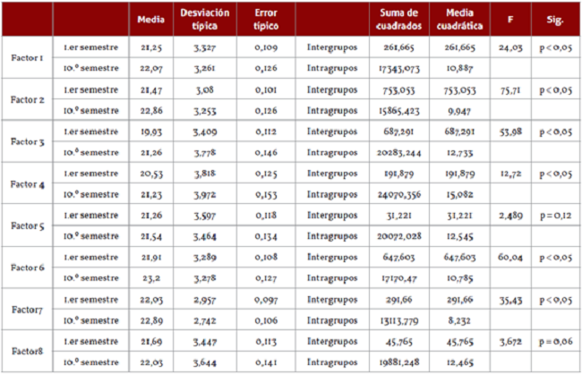 Como la muestra estudiada estuvo conformada por dos grupos separados (estudiantes de primer y último semestre de educación superior, 930 y 571 sujetos, respectivamente) mediante análisis descriptivo, por el tamaño de la muestra no se puede establecer si existe diferencia significativa entre los grupos. Por eso, se realizó un análisis de varianza, se asumió la hipótesis nula de la homocedasticidad a partir del factor grupo (semestres) y se obtuvo como resultado la prueba F con significancias p < 0,05 para las escalas 1, 2, 3, 6 y 7. No hubo diferencia significativa para las escalas 5 y 8 (tabla 3).