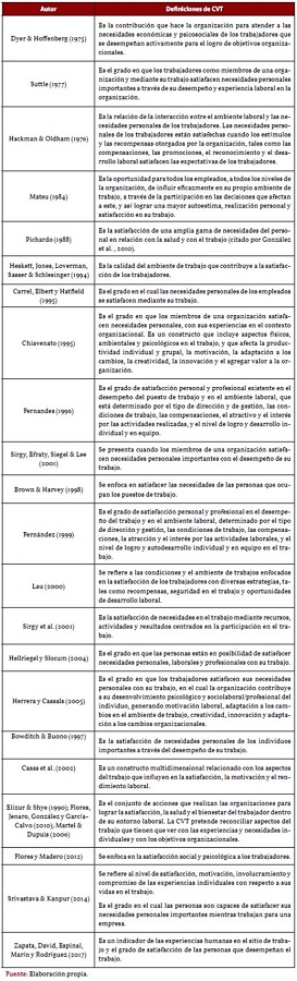 En la literatura, se identificaron 22 definiciones de CVT que consideran como elemento central la satisfacción de necesidades de los trabajadores, específicamente la satisfacción de una amplia gama de necesidades personales, psicosociales, laborales, profesionales y económicas. Entre estas necesidades, destacan la necesidad de reconocimiento, la necesidad de desarrollo individual y en equipo, la necesidad de pertenencia y la necesidad de promoción, de participar en la toma de decisiones, de estar motivados, involucrados y comprometidos con su trabajo, entre otros (tabla 2).