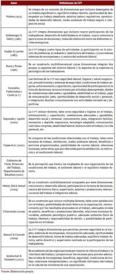 Se identificaron doce definiciones de CVT centradas en la multidimensionalidad de factores que la componen. Los factores o las dimensiones que comprenden la CVT son múltiples y variados. Algunos autores clasifican estas dimensiones en factores del entorno laboral y factores de la experiencia psicológica en el trabajo (Peiró y Prieto, 1996). Sin embargo, en general, los autores tienden a definir la CVT a partir de un conjunto de factores que pueden oscilar entre tres y quince.