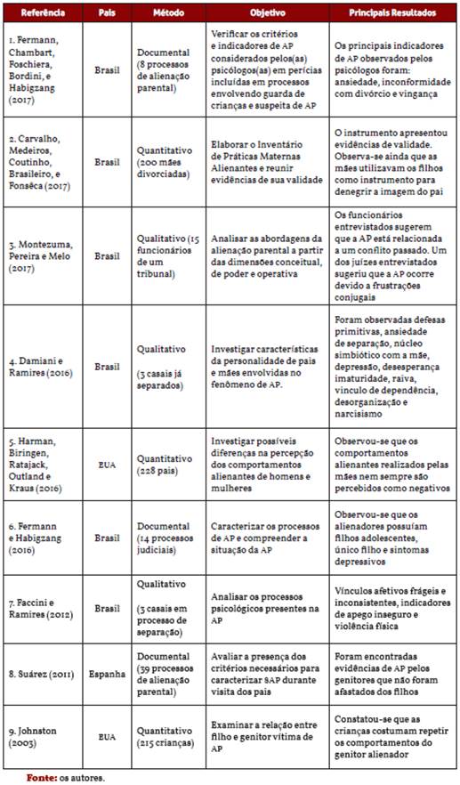 Dentro deste contexto, uma revisão de toda a literatura brasileira sobre AP encontrou apenas 13 artigos publicados sendo que nove eram estudos teóricos (Soma et al. , 2016). Contudo, tal cenário não é característico apenas do Brasil visto que uma revisão sistemática com o objetivo revisar a literatura referente à alienação parental para determinar as melhores práticas para terapeutas e profissionais do direito localizou apenas 10 estudos que propuseram alguma intervenção (psicológica ou jurídica) para a AP (Templer et al. , 2016).