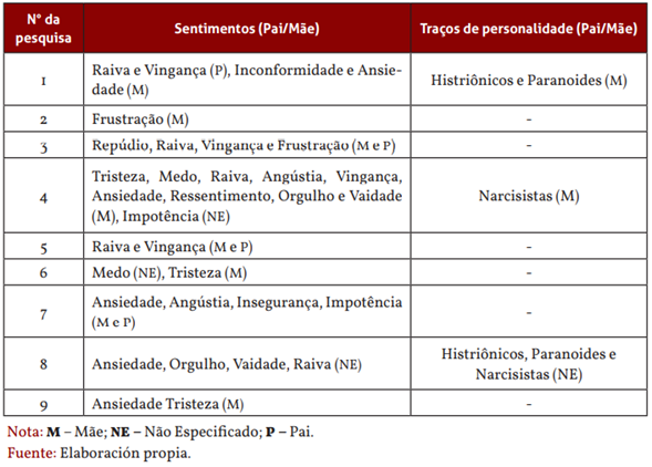 Este estudo evidenciou que os sentimentos da esfera da agressividade são os mais presentes nos genitores alienadores. Em segundo lugar, foram observados os sentimentos da esfera da tristeza e aqueles associados ao perigo. Destaca-se ainda que os alienadores, que participaram de alguns dos estudos incluídos nesta revisão, apresentavam traços de personalidade semelhantes sendo este fator um possível indicativo da relação entre tipos de personalidade e de gravidade da AP.