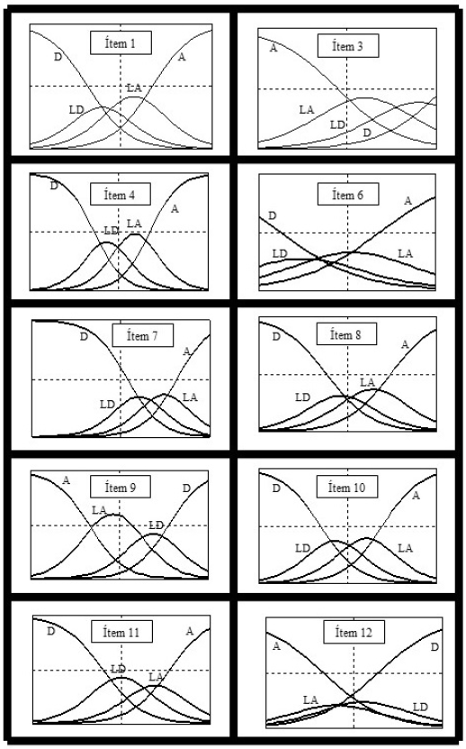 La figura 1 exhibe las curvas características de los diez ítems de la prueba. En términos generales, se registró que las alternativas de respuesta de los ítems permitieron discriminar en algún rango específico del rasgo latente. Sin embargo, se observan excepciones en una categoría de los ítems 4 y 6, para los cuales la opción En desacuerdo tiende a prevalecer por sobre Ligeramente en desacuerdo en la mayoría de los sujetos con niveles bajos del rasgo. El caso más extremo se identi-ficó en el ítem I2, dado que su contenido origina una tendencia a la polarización de los sujetos en las categorías En desacuerdo y De acuerdo sin que demuestren efficacia las opciones centrales.
