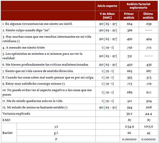 Ítems para la medición de la faceta Depresión. A partir de la revisión de las diferentes operacionalizaciones de Depresión se construyó un mapa conceptual del constructo en el que se sintetizan los indicadores que se reconocen en cada uno de los instrumentos y su frecuencia de aparición (tabla 1). Se realizó una compilación y posterior selección de 15 ítems procedentes de diversos instrumentos que evalúan el rasgo Depresión y otros constructos vinculados. Estos ítems fueron reformulados para que se correspondan con los aspectos considerados por la mayoría de los autores del FFM. Se disenó un formato de respuesta tipo Likert de cuatro categorías (En desacuerdo, Ligeramente en desacuerdo, Ligeramente de acuerdo y De acuerdo). Tras la depuración realizada por los jueces expertos fueron conservados 12 ítems, los cuales fueron administrados a los participantes de esta investigación. Tres de estos reactivos aparecen redactados en sentido inverso (tabla 2).