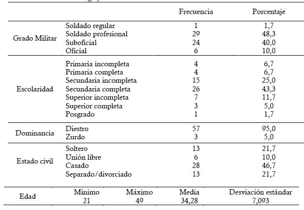 El resultado general de la aplicación de la prueba semiestructurada la cual arrojó los datos sociodemográficos se puede visualizar en la Tabla 1, en la cual el porcentaje mayor (48,3%) fueron soldados profesionales, el 43,3% la gran mayoría tienen una escolaridad de secundaria completa, el 95% son diestros y en un 46,7% casados.