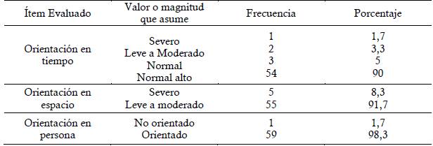 En la Tabla 2 se observa que la población no muestra alteraciones relevantes a nivel de la variable orientación, no obstante, en "Orientación en espacio" se evidencia un margen mínimo de población con una magnitud severa correspondiente al 8,3%, además, se denota que la mayoría se encuentra orientado en sus tres esferas de persona, tiempo y espacio con frecuencias de 59, 54 y 55 respectivamente.