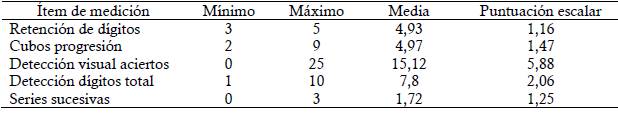En cuanto a la variable de atención y concentración, en la Tabla 3 se observó en el ítem de "Detección visual aciertos" una puntuación escalar = 5,88 equivalente a un promedio bajo en atención selectiva visual, siendo comparable con la media general para esta población (M = 18); en el caso de "Detección de dígitos total", el resultado arrojó una puntuación muy baja evidenciando compromiso severo en procesos de atención sostenida de carácter auditivo.
