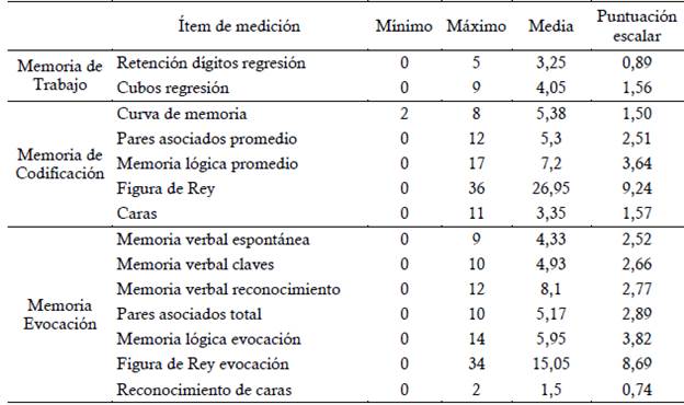 Como se observa en la Tabla 4, para la evaluación de la Memoria de trabajo el ítem "Cubos regresión" obtuvo una puntuación escalar alta, el cual indica fallas en procesos de memoria ejecutiva; en cuanto a "Retención dígitos regresión" el rendimiento de la muestra fue bajo de acuerdo con la baremación de la batería Neuropsi. Así mismo, se observa que en Memoria de Codificación, los resultados de los participantes en "Figura de Rey" se distancian de la media, además se percibe que los procesos auditivos verbales ("Curva de memoria") están ubicados en un rango de bajo a leve moderado, y los procesos de percepción ("Caras"), codificación ("Memoria lógica promedio") y planeación visual ("Pares asociados promedio") están en el límite entre moderado y severo.