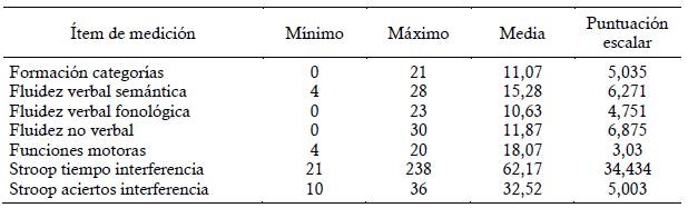 En la Tabla 5 se presentan los resultados de las funciones ejecutivas, donde se encuentra que la prueba de "Stroop tiempo interferencia" fue la que mayor puntuación escalar presentó, ubicándose en el límite entre moderado a severo; a su vez se presentan compromisos de leve a moderado en procesos de categorización ("Formación categorías") y "Fluidez verbal semántica" como "Fluidez verbal fonológica".