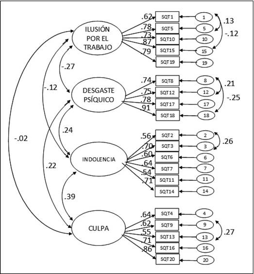Como se observa en la tabla 2, el modelo hipotetizado inicial no presentó un ajuste adecuado a los datos: X2 = 355.96, p < .001, GFI = .808, NNFI = .844, CFI = .865 y RMSEA = .088, por lo que se liberaron covarianzas entre errores, pero siempre entre ítems de la misma escala. Se liberaron de manera progresiva considerando el valor de los índices de modificación, de mayor a menor, las siguientes covarianzas: (1) Ilusión por el trabajo (dos relaciones): Ítem 1-Ítem 5, Ítem 1-Ítem 15; (2) Desgaste psíquico (dos relaciones): Ítem 8-Ítem 12, Ítem 8-Ítem 18; (3) Indolencia (una relación): Ítem 2-Ítem 3 y (4) Culpa (una relación): Ítem 9-Ítem 13. En total se liberaron seis relaciones (figura 1).