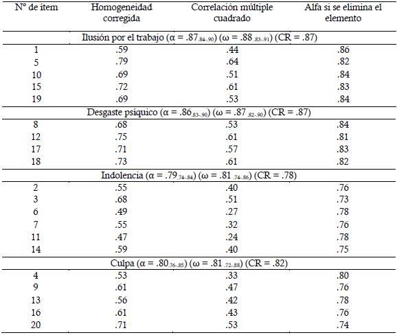 La tabla 4 presenta los valores alfa de Cronbach y omega de McDonald para todas las escalas que componen el CESQT. Se evidencian consistencias internas y valores de fiabilidad compuesta adecuados para todas las escalas. Es el caso de Ilusión por el trabajo, Desgaste Psíquico y Culpa que presentaron valores superiores o iguales a .80, e Indolencia que presenta un valor alfa ligeramente inferior pero confiable (α = .79). Para el coeficiente omega de McDonald se obtuvieron resultados superiores a .80 para todas las escalas. La homogeneidad corregida fue alta para todos los ítems, con valores superiores a .40, lo cual asegura la fiabilidad de los ítems y de las escalas en general. En cuanto al valor alfa al eliminar el ítem, todos los ítems aportan al incremento de la consistencia interna de cada una de las dimensiones que miden el SQT (tabla 4).