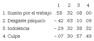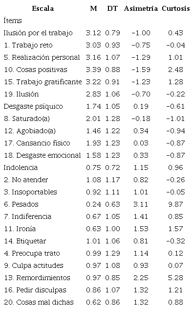 La tabla 1 muestra los descriptivos de los ítems y de las escalas que constituyen el CESQT. Se observa que las medias más altas se obtuvieron para los ítems que forman la dimensión Ilusión por el trabajo, específicamente, los ítems 10 (M = 3.39; "Pienso que mi trabajo me aporta cosas positivas") y 15 (M = 3.22; "Mi trabajo me resulta gratificante"). Las medias más bajas corresponden al ítem 6 (M = 0.24; "Creo que los familiares de los colaboradores/as son unos pesados") de la escala de Indolencia y el ítem 13 (M = 0.46; " Tengo remordimientos por algunos de mis comportamientos en el trabajo") de la escala de Culpa.