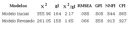 El modelo hipotetizado revisado presentó los siguientes resultados (tabla 2): X2(158) = 261.05, p < .001, X2/gl = 1.65, RMSEA = .066(051-079), que resultaron inferiores a los obtenidos en el modelo inicial, con el valor del RMSEA inferior a .080. Aunque el índice de bondad del ajuste ó GFI = .858 resultó ligeramente inferior al valor que se plantea como adecuado, el valor del CFI = .927 y del NNFI = .913 indican que un ajuste adecuado del modelo a los datos.