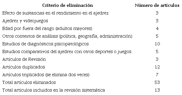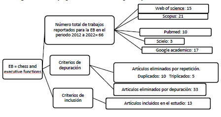 Después de establecer los descriptores a utilizar en la ecuación de búsqueda, se procedió al análisis de las estadísticas a partir de la producción científica encontrada en las bases de datos, para el período 2012-2022. El reporte de datos bibliográfico fue importado a un libro de Excel, y las bases de datos se depuraron manualmente, de acuerdo con los siguientes criterios de eliminación de estudios: artículos duplicados o triplicados; revisiones conceptuales; investigaciones cuya población estuvo conformada por adultos mayores al considerar el deterioro cognitivo; investigaciones relacionadas con diagnósticos psicopatológicos; investigaciones concernientes a videojuegos; estudios comparativos del ajedrez con otros deportes o juegos y funciones ejecutivas cálidos. Los criterios de inclusión fueron investigaciones cuya muestra estuvo conformada por niños, jóvenes y adultos; investigaciones que suponen un desarrollo neurotípico; investigaciones de carácter empírico con evidencias; asimismo, investigaciones que incluyeron en el análisis funciones ejecutivas cognitivas (planificación, memoria de trabajo, inhibición y flexibilidad cognitiva).