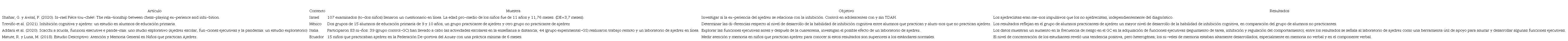 En las tablas 2 a la 5 se describen los estudios incluidos en el análisis de acuerdo con el reporte de su objetivo, método y resultados. Se encuentran distribuidos según las siguientes funciones ejecutivas: inhibición, flexibilidad cognitiva, planificación y Memoria de trabajo, finalmente el estudio que rechaza esta relación. En referencia de los indicadores propuestos, a partir de los resultados encontrados se localizó mediante la ecuación de búsqueda el reporte de sesenta y seis artículos en las revistas científicas consultadas; luego de aplicar los criterios de depuración, la muestra de trabajos incluidos en el estudio fue de trece. La mayoría de los artículos en Scopus estaban duplicados en Web of Science y Pubmed, por lo cual de estas dos bases de datos no se seleccionaron artículos.