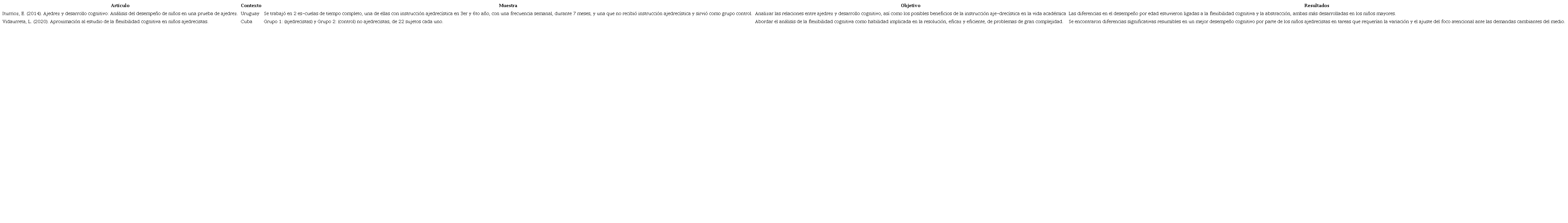Las investigaciones presentadas en la tabla 5 se llevaron a cabo en niños de 7 a 12 años; tienen en común la comparación de un grupo de practicantes de ajedrez con no practicantes, además de coincidir en la evaluación de algunas tareas como el test de clasificación de cartas de Wisconsin y el test de Porteus; asimismo, utilizaron otros instrumentos, como ENFEN (senderos), Test de Stroop y Torre de Londres. Sus resultados evidencian la relación existente entre el ajedrez y las funciones ejecutivas a favor de los practicantes del ajedrez.