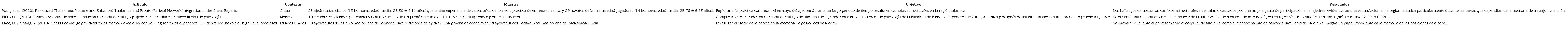 En las investigaciones presentadas en la tabla 4, la población seleccionada fueron jóvenes y adultos desde los 18 años de edad, en dos de ellas integrantes de clubes de ajedrez (Wang et al., 2020 y Lane et al., 2018). En la realizada por (Piña et al. 2018), la muestra utilizada fueron estudiantes universitarios que recibieron una formación en ajedrez, los métodos usados fueron: prueba de memoria de ajedrez, una prueba de ajedrez, un cuestionario para preguntar sobre su experiencia en ajedrez y un Test de inteligencia fluida; Raven Matrices Progresivas Estándar y test Neuropsi en las pruebas de retención dígitos en progresión y regresión, y cubos en progresión y regresión, en pretest y en postest. En ninguna de las tres investigaciones de la relación tres del ajedrez con la memoria de trabajo coinciden los métodos usados; de igual manera, la edad de las muestras es diversa.
