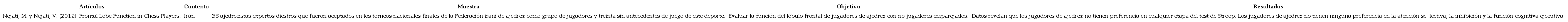 En la última clasificación de esta revisión presentada en la tabla 6 se halló un estudio en el que, a diferencia de los otros analizados en esta revisión, Nejati y Nejati (2012) plantean que no se muestran diferencias significativas entre los no practicantes y practicantes de ajedrez. Los datos revelan que los jugadores de ajedrez no tienen preferencia en cualquier etapa del test de Stroop.