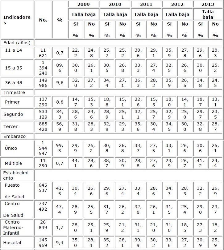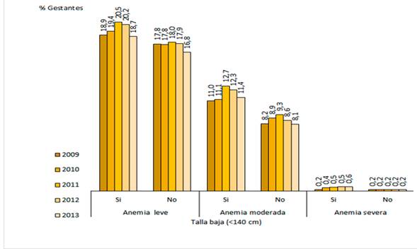 Methods: A cross-sectional study was carried out in which were used 1 555 847 records of pregnant women from the System of Information on Nutrition Status of the Food and Nutrition Center of the National Health Institute from 2009 to 2013 . These women had been evaluated in health facilities of the Peruvian Ministry of Health. Pregnant women with short stature (≤ 1.40 cm) and anemia (Hb <11 g / dL) were evaluated, with hemoglobin corrected for altitude.