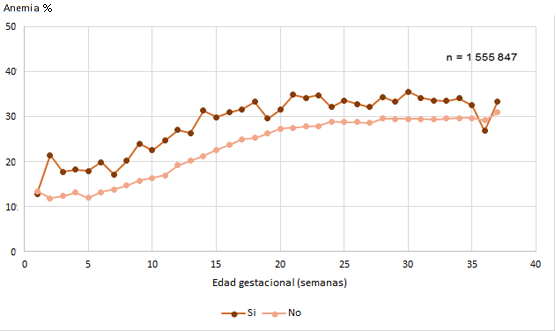Las proporciones de anemia, también se mantuvieron durante las semanas de embarazo, y se incrementó conforma avanzaban las semanas de embarazo, mayores para las gestantes con talla baja (Fig. 2).