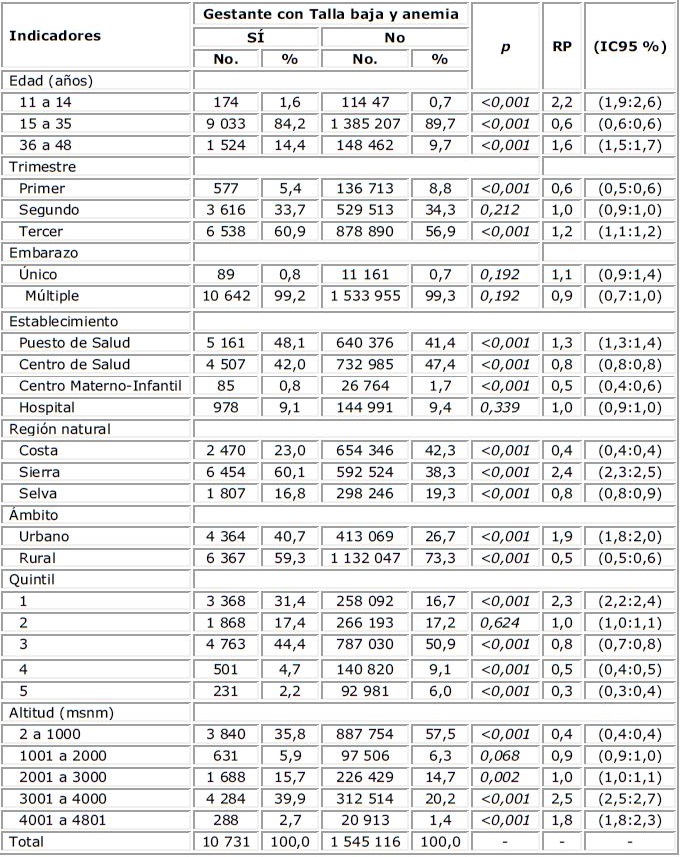 Resultados: El 2,2 % presentó talla baja. El 89,6 % tenía entre 15 a 35 años. Entre las gestantes con talla baja el 30,1-33,7 % tenían anemia, y entre el 25,1 -27,5 % en gestantes sin talla baja. Se asociaron a gestantes con talla baja y anemia, la edad entre 11 a 14 años (RP: 2,2 IC95% 1,9-2,6), tercer trimestre del embarazo (RP: 1,2 IC95% 1,1-1,2), atendida en puesto de salud (RP: 1,3 IC95% 1,3-1,4), residir en la sierra (RP:2,4 IC95% 2,3-2,5), del ámbito rural (RP: 1,9 IC95% 1,8-2,0), quintil 1 (RP: 2,3 IC95% 2,2-2,4) y altitud entre 3 001 a 4 000 metros sobre el nivel del mar (RP: 2,5 IC95% 2,5-2,7).