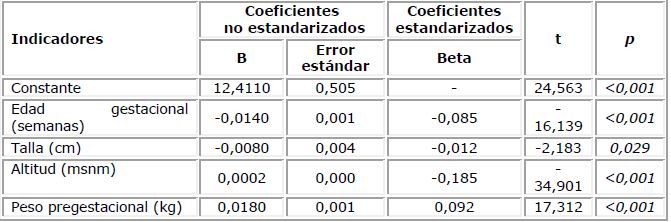 Para el cálculo de una ecuación en la cual se pueda determinar las concentraciones de hemoglobina en gestantes con talla baja, se pudo apreciar que la edad gestacional y la talla reducen estas concentraciones, pero la altitud y el peso pregestacional las incrementan. Así mismo, con la finalidad de estimar la relación entre las variables estudiadas y las concentraciones de hemoglobina en gestantes con talla baja, señalamos que la edad gestacional, talla materna, altitud y peso pregestacional explican el 5,4 % de las concentraciones (R2= 0,054; R2ajustado = 0,054) (tabla 3).