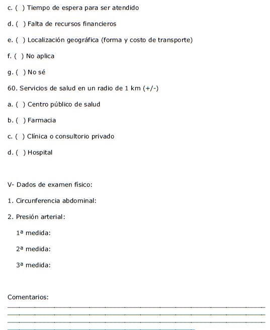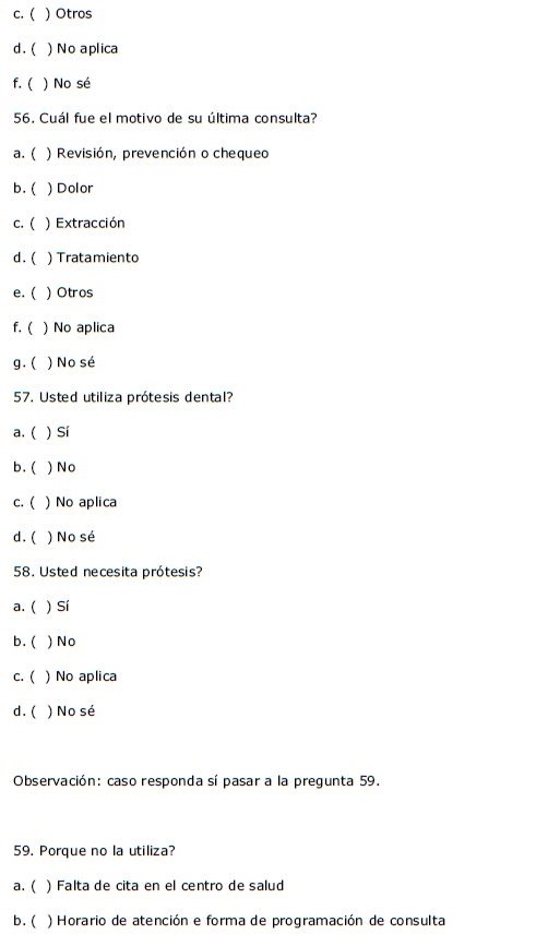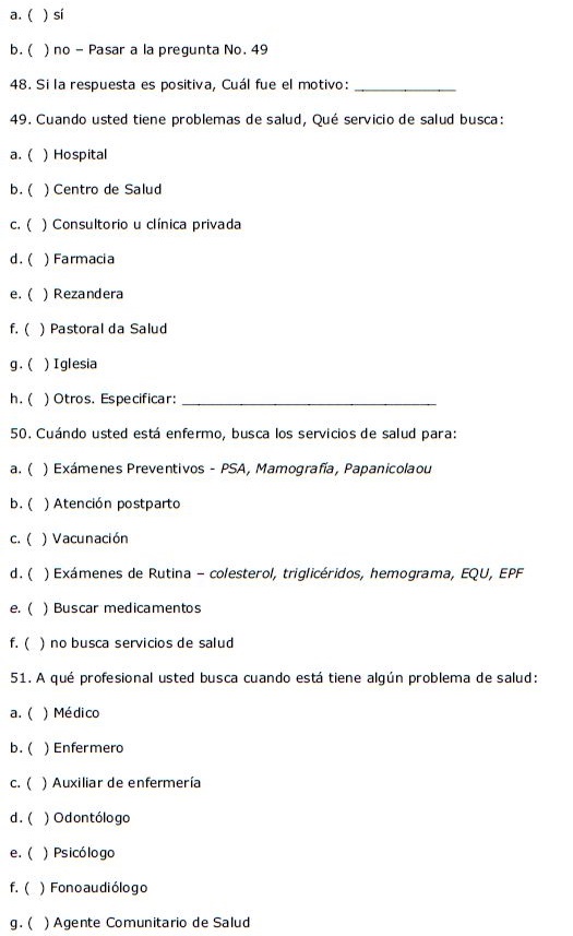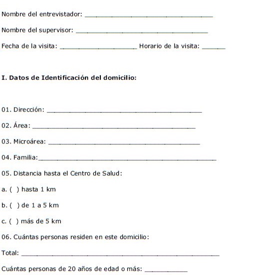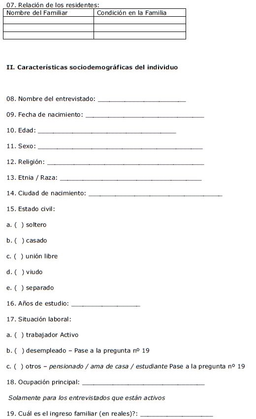 Los datos se obtuvieron por medio de entrevistas estructuradas realizadas en el domicilio de las personas seleccionadas. Las entrevistas se realizaron por cinco equipos conformados por agentes de salud, auxiliares de investigación y funcionarios de la alcaldía. Cada equipo recolectó información en una microárea (barrio) diferente, las cuales se definieron de acuerdo con la territorialización establecida por el Programa de Salud de la Familia. Durante el periodo de recolección de datos se realizaron entrevistas de control y confirmación de datos por parte de los investigadores en cada una de las áreas del municipio.